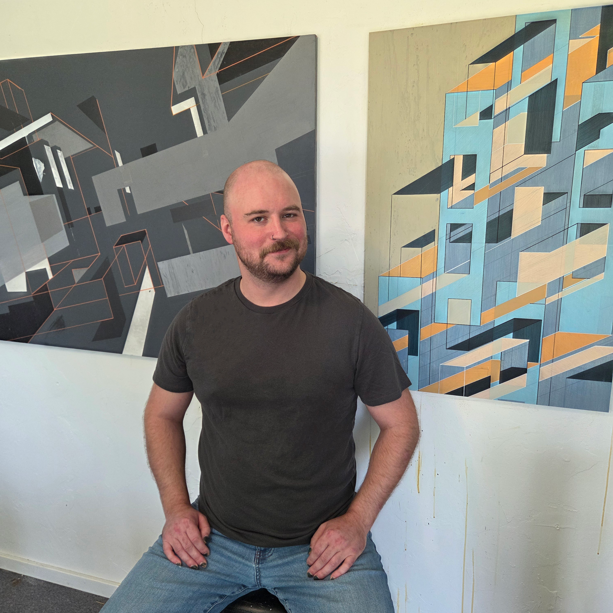 Inspired by cubism and brutalist architecture, I use layers of colorful paintings and precise linework to build my abstract architecture. Exploiting the ambiguity of translating three-dimensional spaces in to two-dimensional art, elements compete against their immediate context, but resolve into a larger harmony as they traverse the artwork.